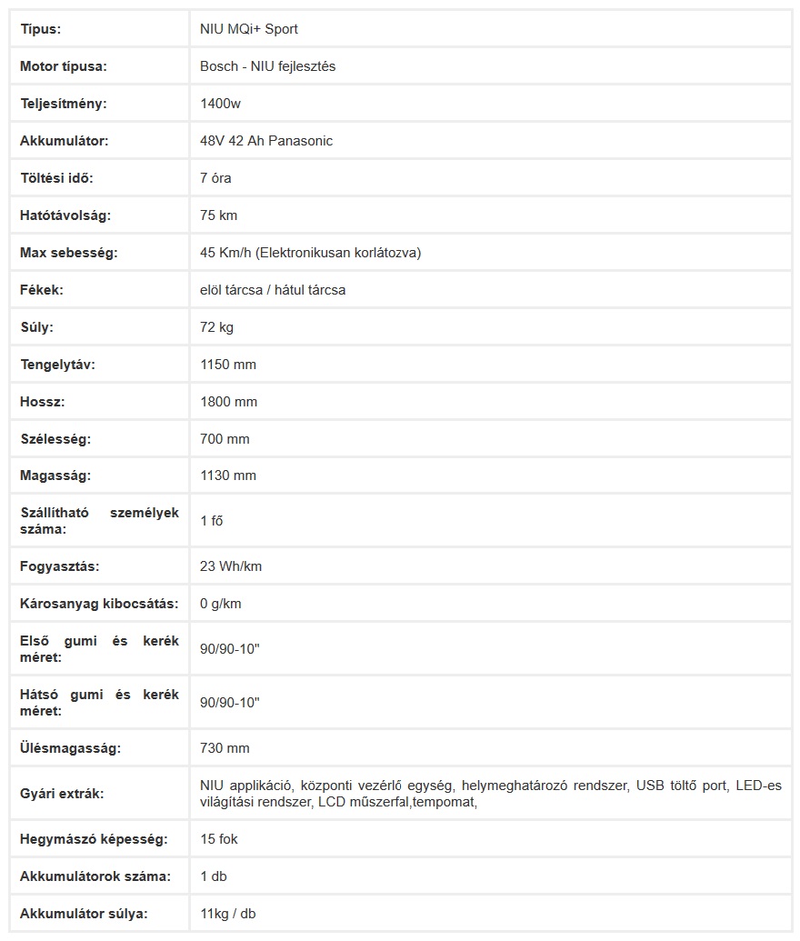 Maximum sebessége 45 km/h (elektronikusan korlátozva). Egy töltéssel 75-100 km-t képes megtenni. 0%-ról 100%-ra 7 óra alatt tölthetjük fel az akkumulátort (bár nem ajánlott teljesen lemeríteni). A NIU MQi+Sport-ot 5 különböző színben rendelheted meg.